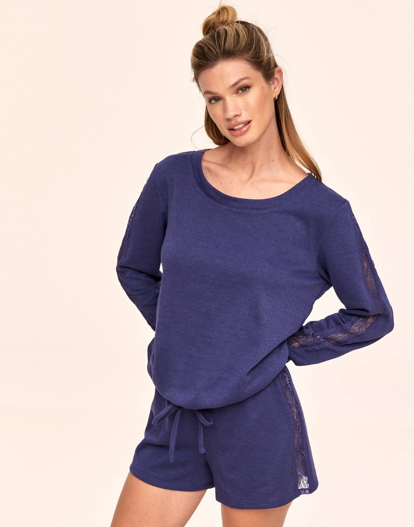 If you’re someone who prioritizes practicality yet also likes to obsess over the little details, then our cozy terry-knit sweatshirt & short set—featuring sweet lace details on the sides—is perfect for you. (Available in sizes XS–4X!)