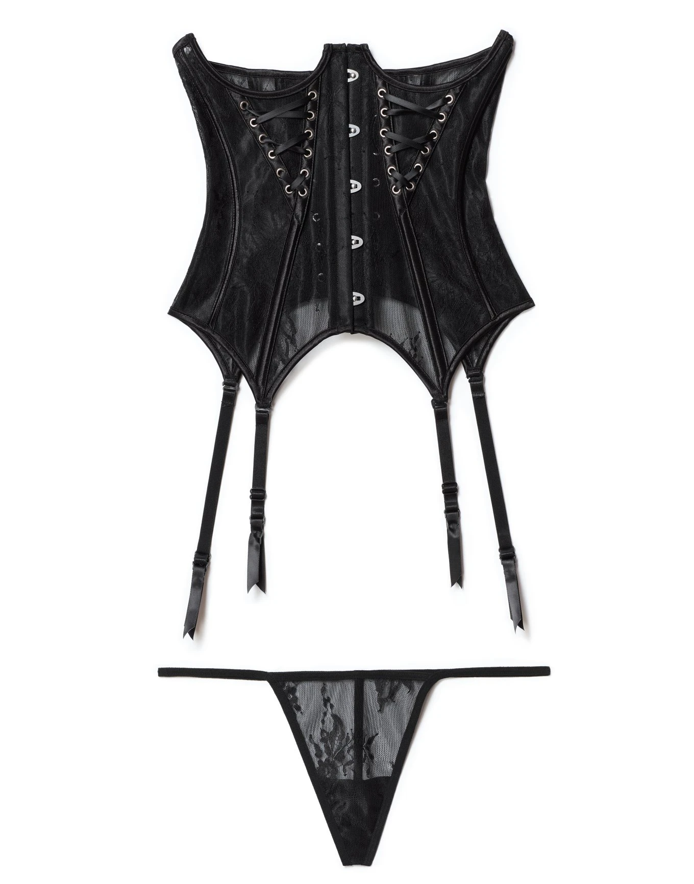 This strapless corset is perfect for those who want to show off their curves. The black lace corset has all the classic details you love, like removable garters, functional lace up detail on the back, and a matching g-string panty. (Available in plus-size 0X-4X).
