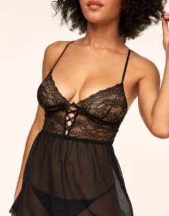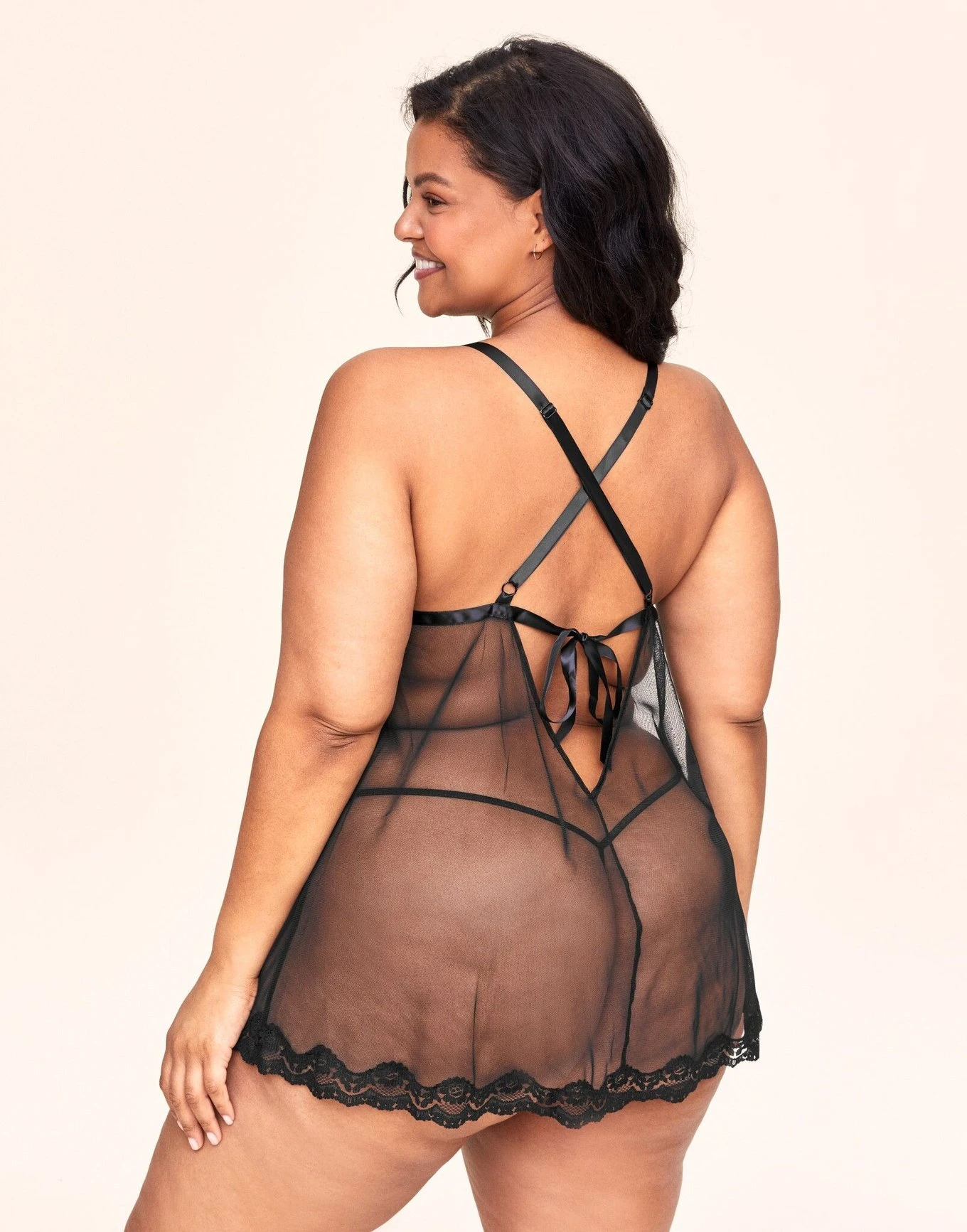 Now you can wear a babydoll without looking like a babydoll! The black lace Alicia is here. Slip into this unlined babydoll featuring Tiny ribbon straps and bow details. This airy set is luxurious with an ultra-romantic vibe. Layer it well and wear it out or keep it light and wear it to bed!