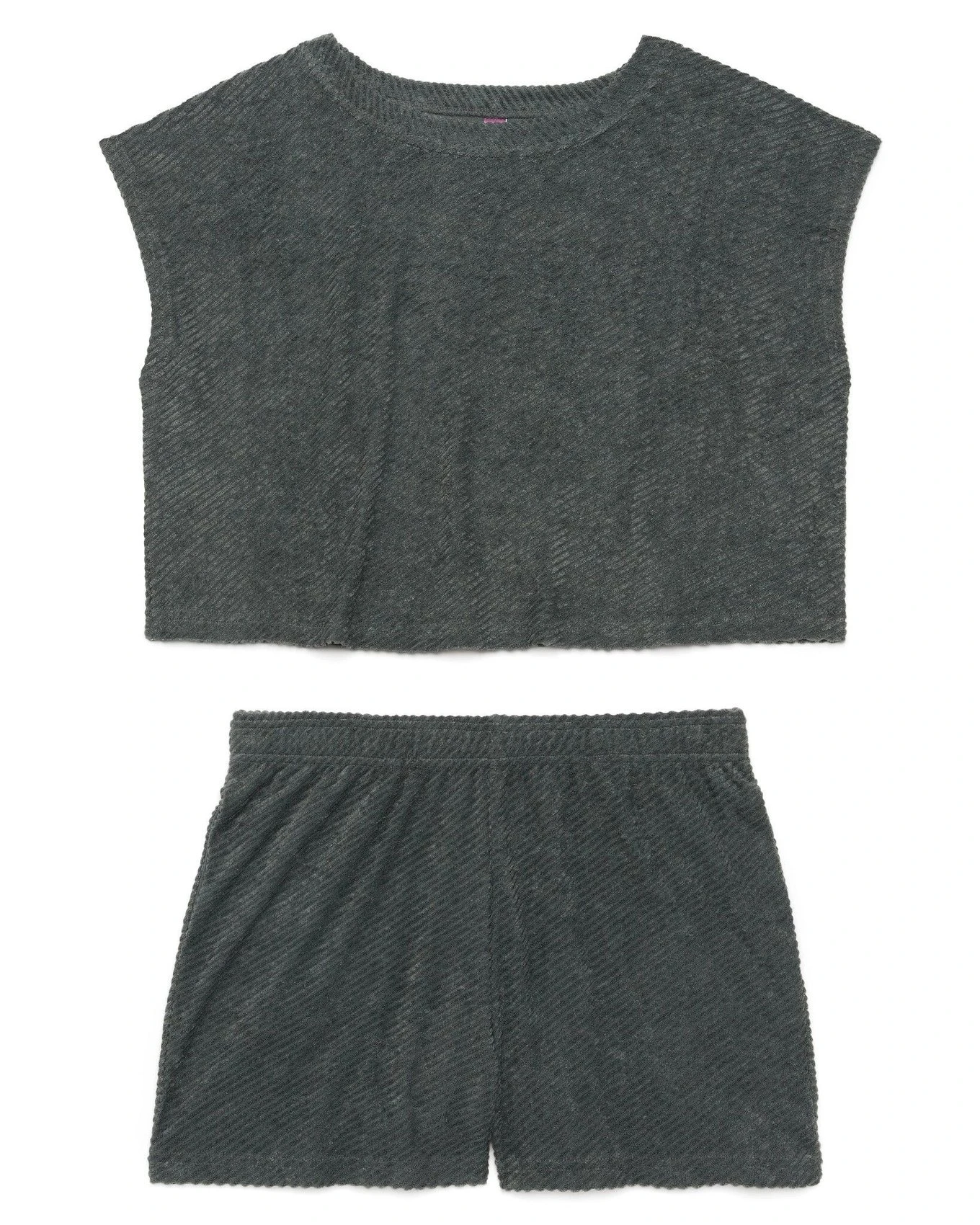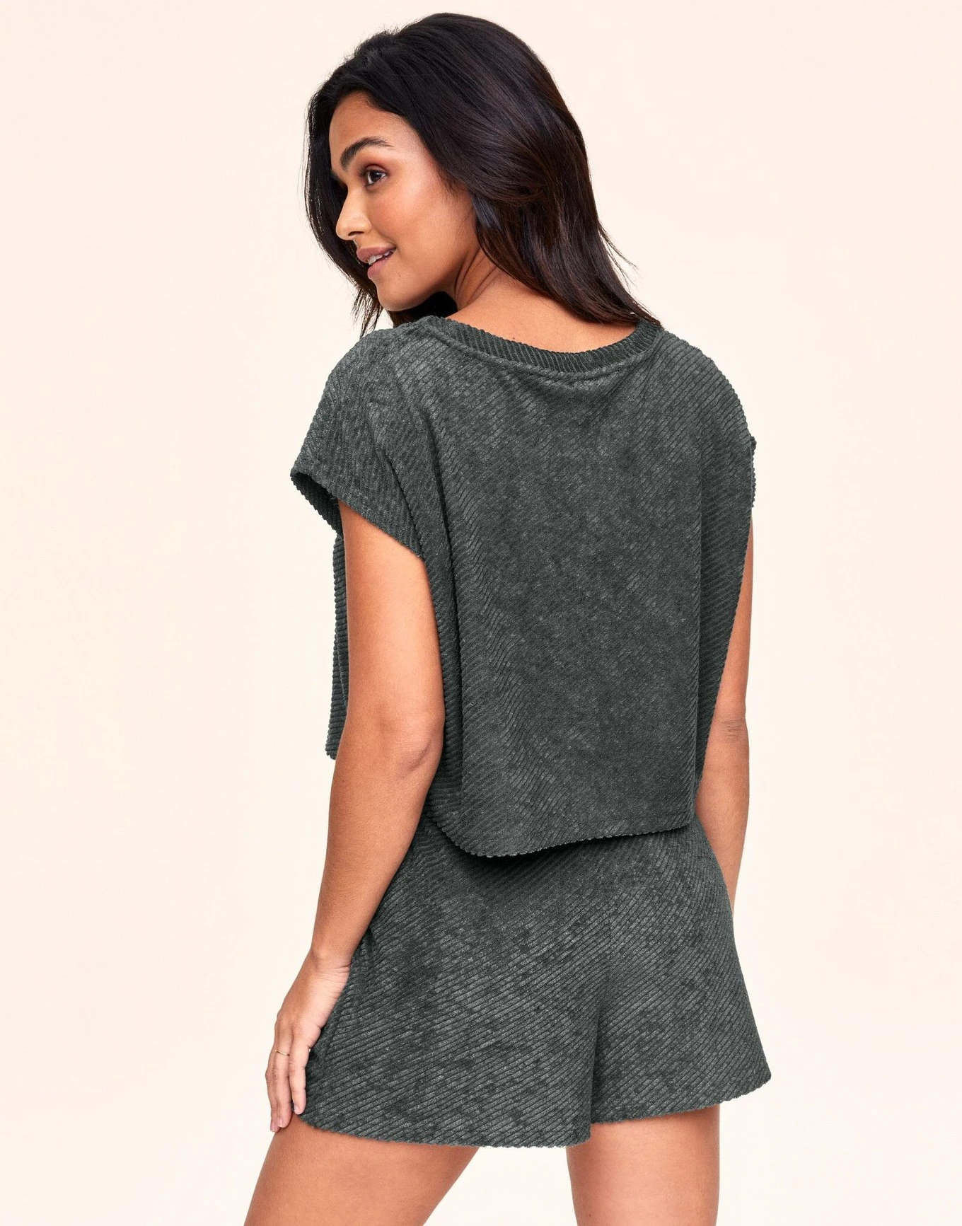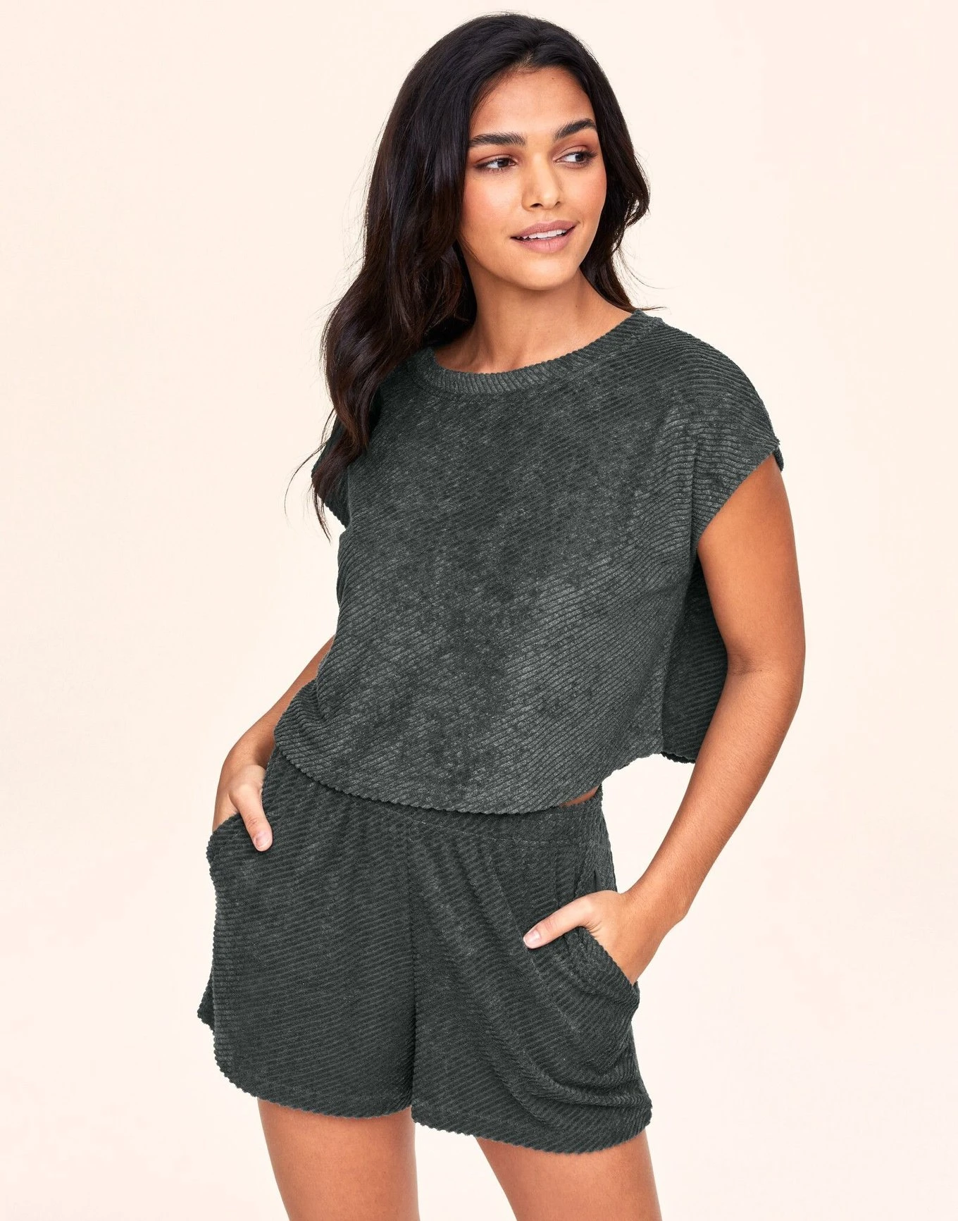 Time to tell the rest of your loungewear drawer to make some room, ‘cause this matching cropped boxy top and high-rise short set (with pockets!) is about to up your comfy game. Slip on this pull-on fit with ease and cozy up in Amina’s textured chenille rib-knit fabric—you won’t be able to get enough of both! Perfect for napping, lounging, or running to the store, this two-piece essential in urban-chic gray is just as efficient as it is effortless & laidback—and we are here for every mood & occasion.