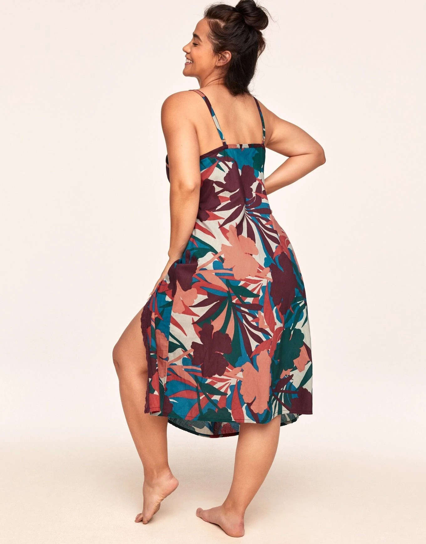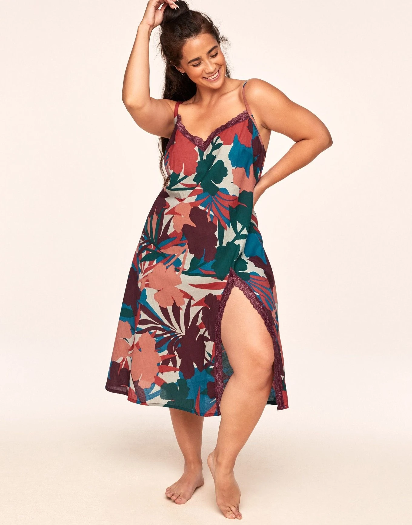 Tropic like it’s hot! Our fresh, new botanical print is here to transport you to faraway islands lined with endless palm trees—and in our opinion, you won’t be mad about it. Accented with flirty lace-trim details and finished with a flattering high-cut slit (go ahead and show a little leg!), our comfy cotton Analise slip will hands down become your go-to, casual-yet-chic one-piece for spring, summer, and beyond. (See Analise for more sizes.)