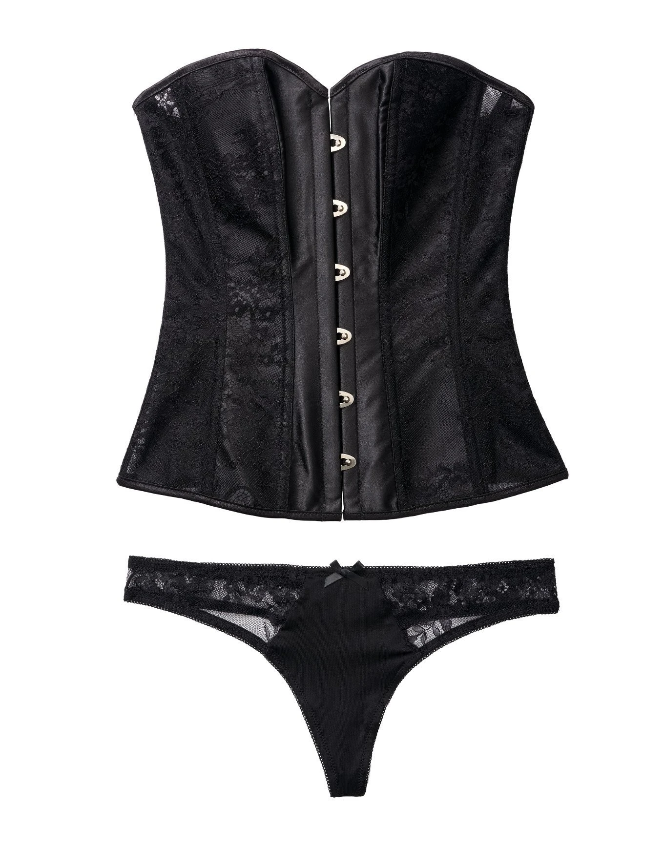 Get hooked! This sexy black lace & satin corset flatters your curves and easily hooks at the front so you can take on your night effortlessly. Tie it up at the back and wear the matching thong for your finished look! (See Ashoka Plus for more sizes!)