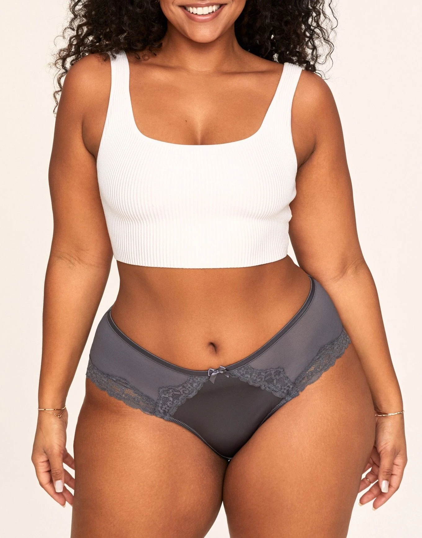 These plus-size hipster panties feature a pretty gray sheer fabric with a dainty bow at the waist. They’re perfect for everyday wear or a special night in. (Available in sizes 0X-L.)