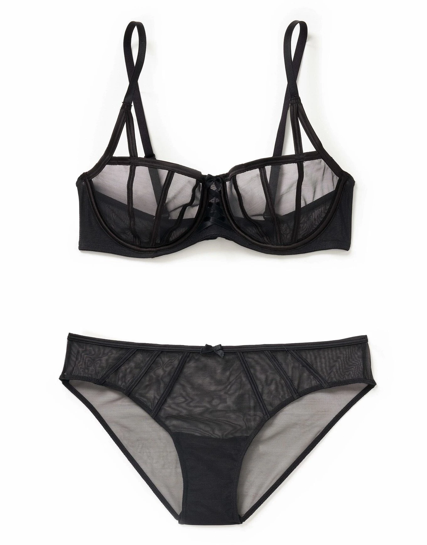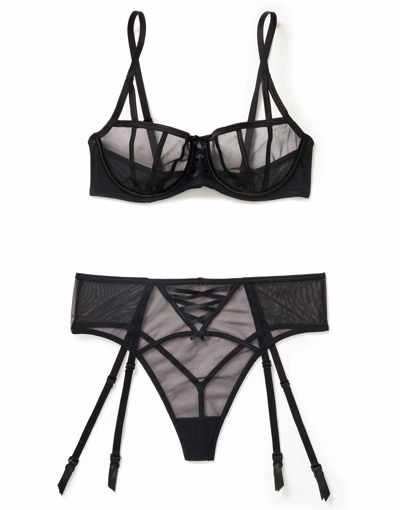 Almost too hot to handle! Our latest lingerie gear is all sheer and made to keep around all year. Inspired by vintage corsets with thoughtfully crafted style lines and lace-up satin details at the center for a delicate touch, this sexy yet supportive bra is perfect for wearing on its own at midnight. Pair it with matching black stockings and the matching bikini or high-waist gartered thong to complete the entire look.