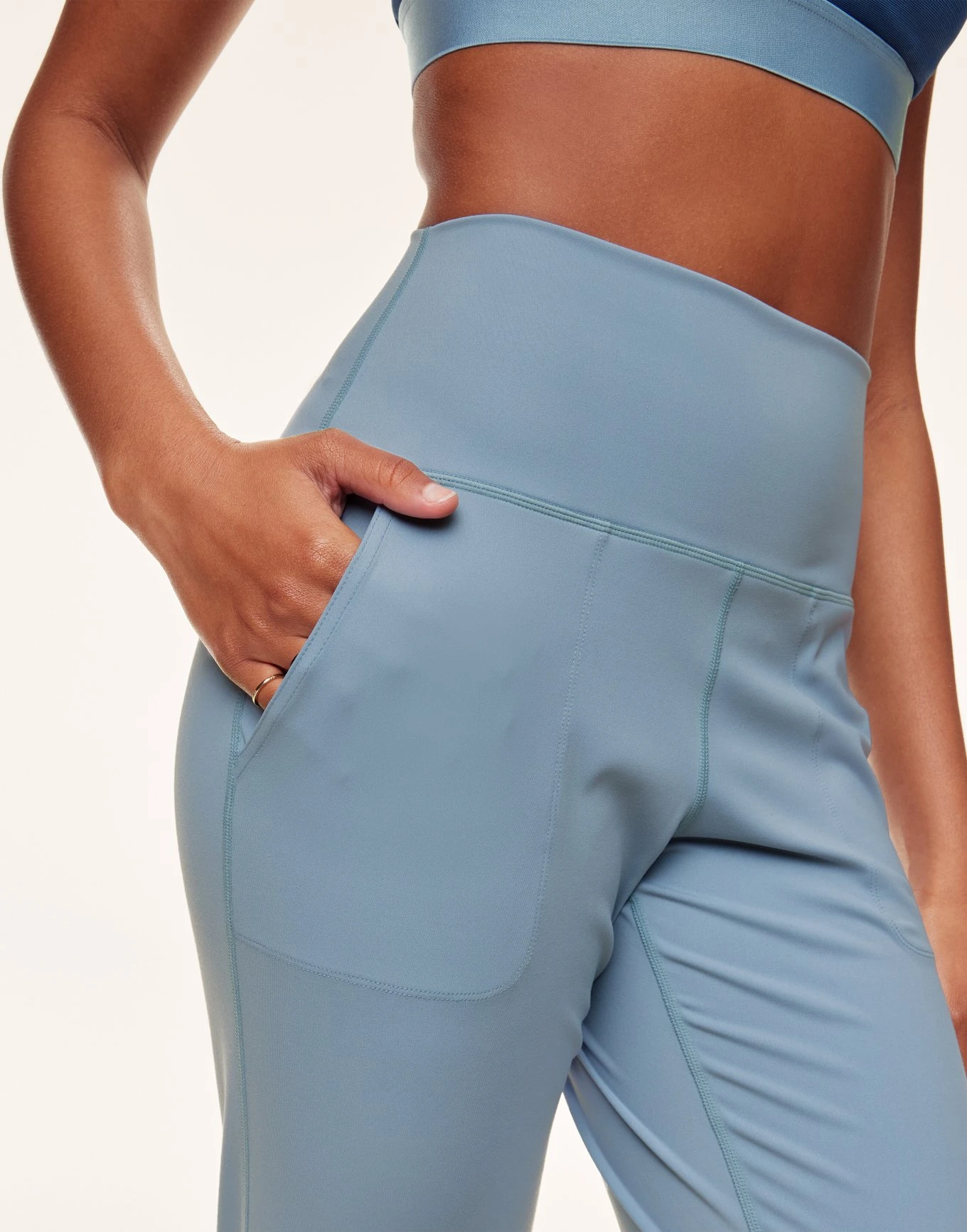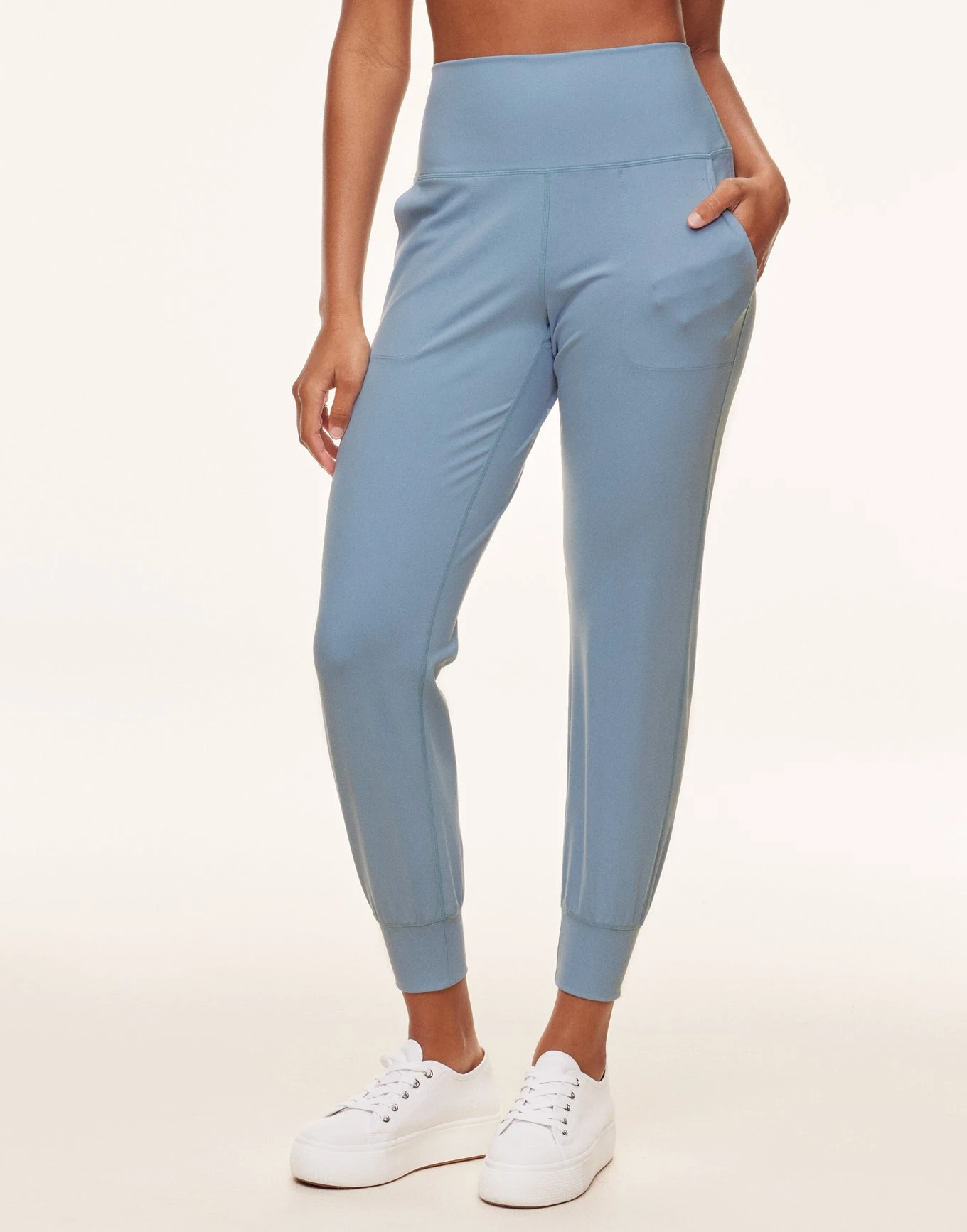 The perfect jogger for your everyday activewear. The Cozy Jogger features a knit fabrication in a medium blue hue. It has a drawstring waist and ribbed details at the ankle. This style is available in XS-XL.