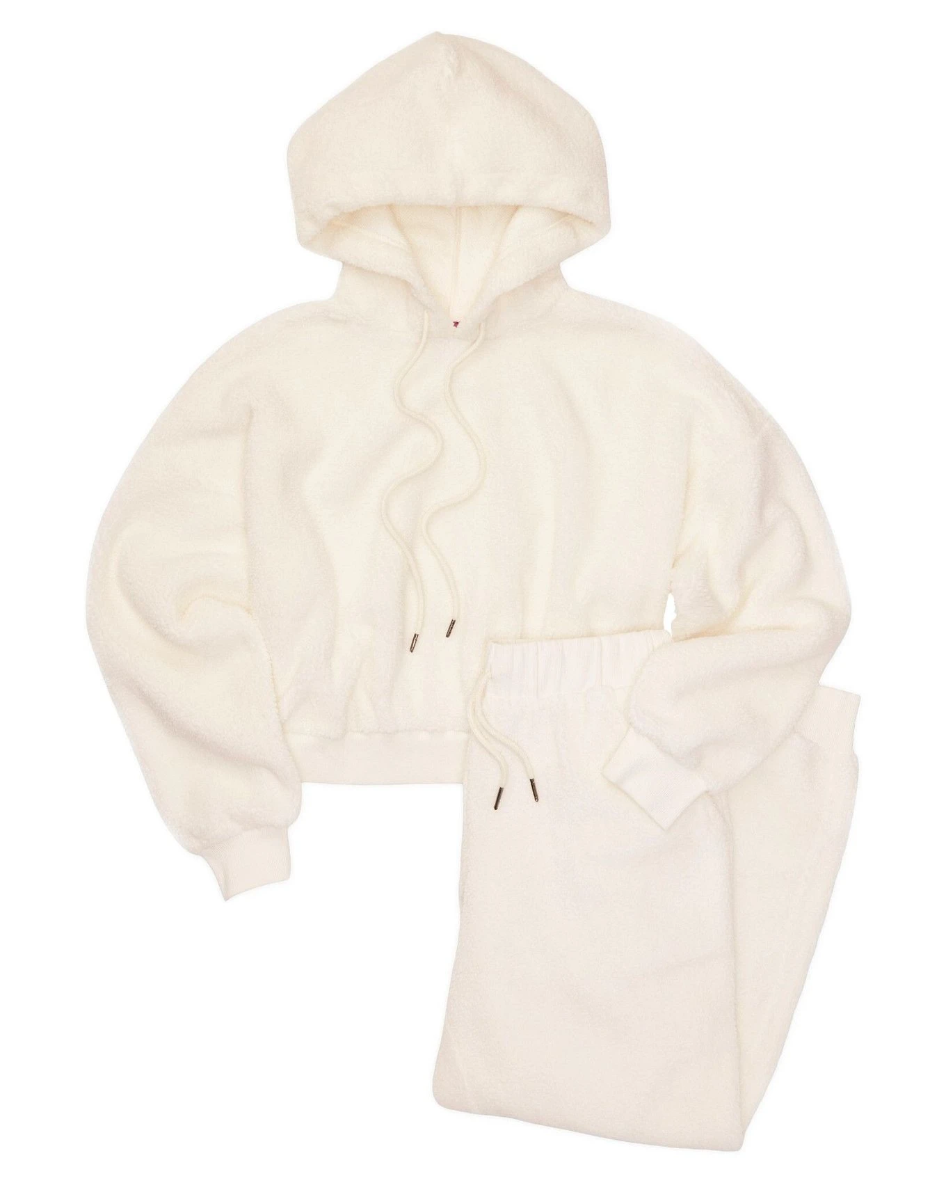 Plush perfection: Meet our super-soft sherpa hoodie & sweatpant set (made even better with comfy, convenient pockets!) you’ll wanna wear all cozy-season long. Available in sizes XS–4X!
