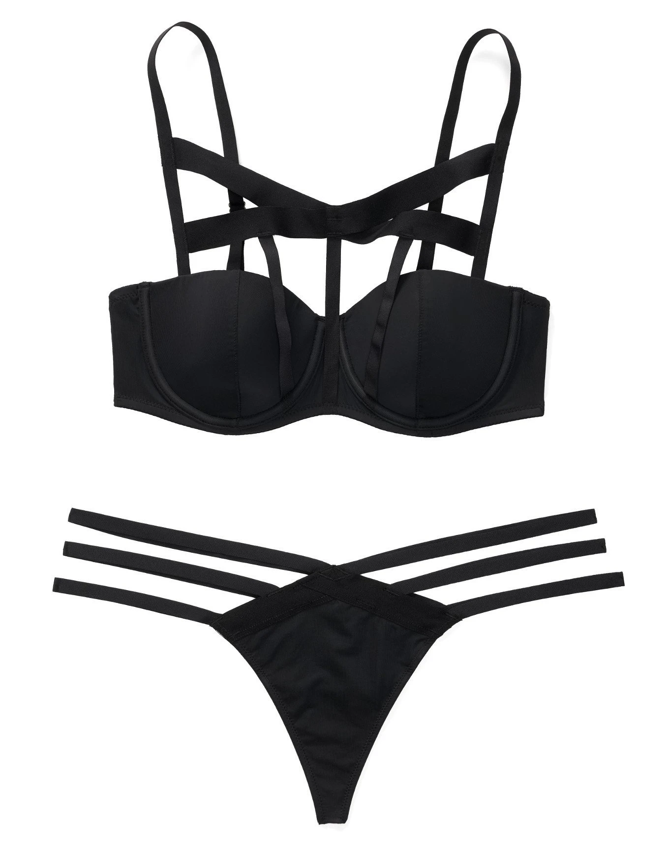Attention, please! Kiania’s bold black balconette is ready to steal the spotlight with its strappy cage front designed to show off your curves. Pair it with the sexiest matching thong to complete your daring match!