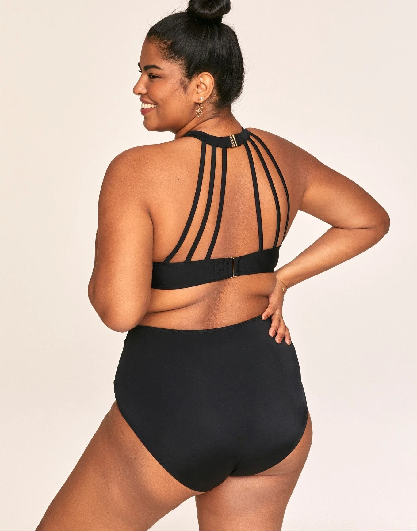 Hello, sexy strappy swimwear! Be a showstopper this season in a black bikini with strappy details from the front and back! Featuring contour cups and a matching high-waist bottom, Enisa’s here to fully support you.