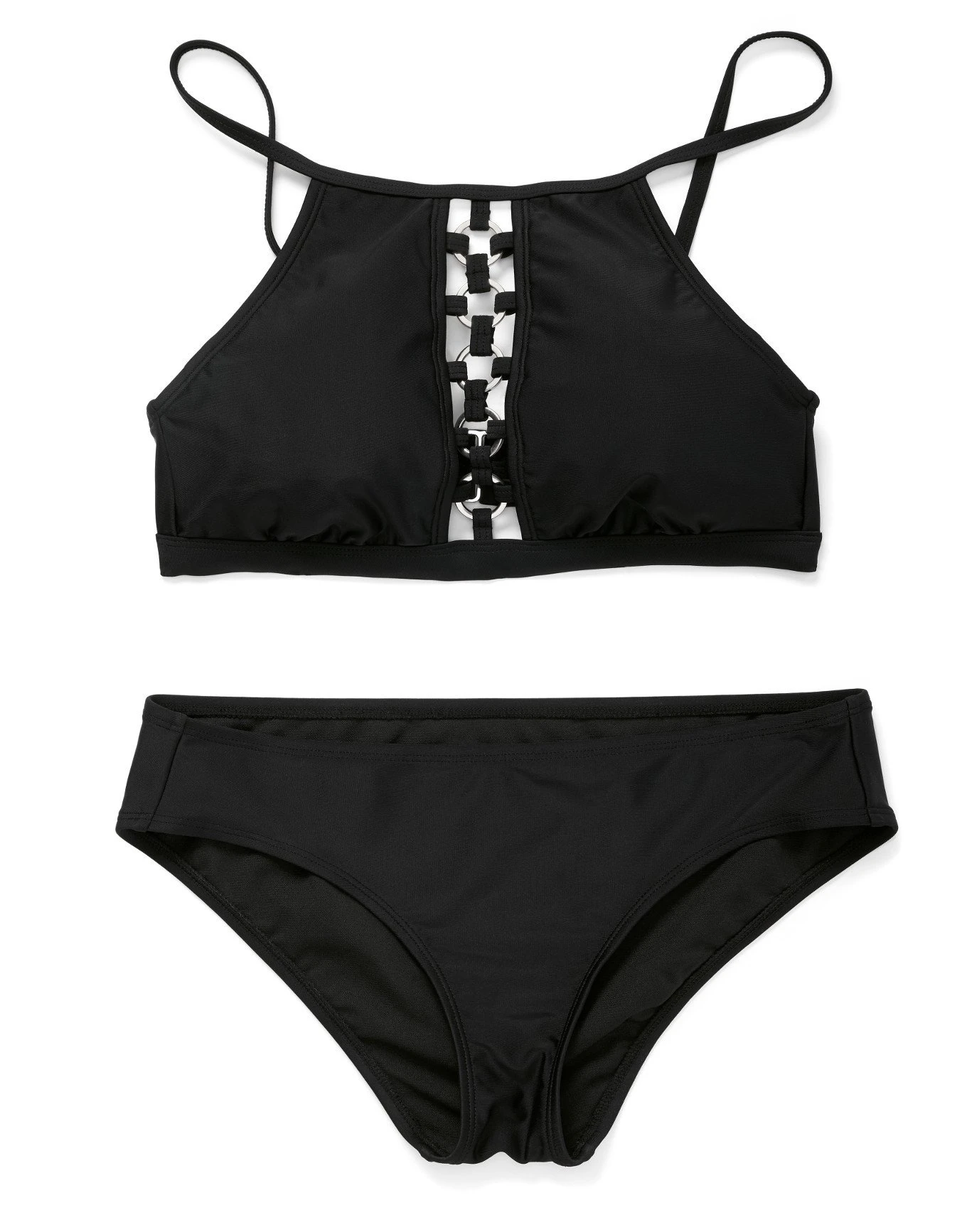 Be the center of attention in this bold strappy-front high-neck! Accented with silver rings and designed to show off your cleavage, Faenza will totally be turning heads…