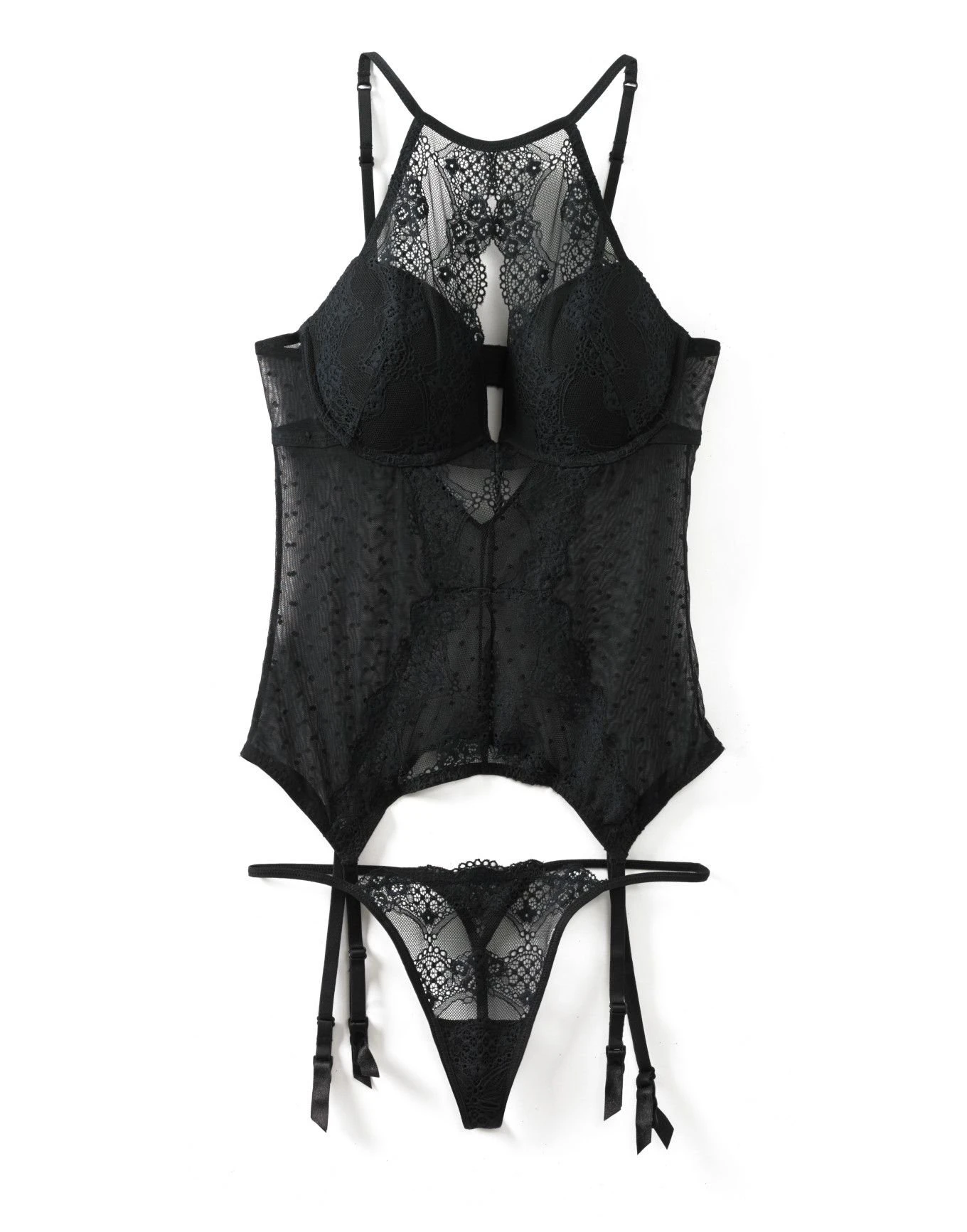 Show off your figure in the show stopping black Heathyr. This gartered bustier will hug your curves in all the right ways with dot mesh and beautiful lace. The open high neck is a jaw dropping detail in lace. With removable pads you’re able to choose the right lift for you! Complete the look with a matching thong.