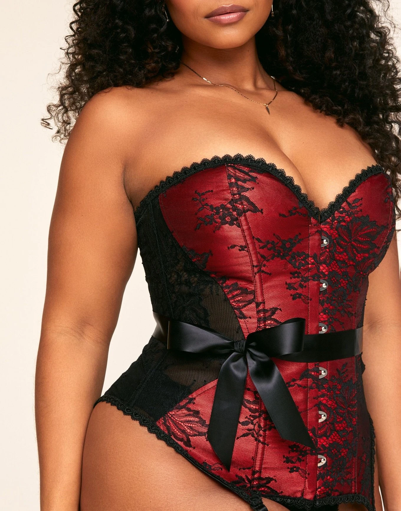 Spice up your (lingerie) life with our flattering lace & satin corset featuring a sweetheart neckline, curve-accentuating body, lace-up back feature, and tie at the waist to gift-wrap yourself up in. Pair it with the matching thong, and attach the garters to matching stockings to make a statement. (Available in sizes XS–4X!)