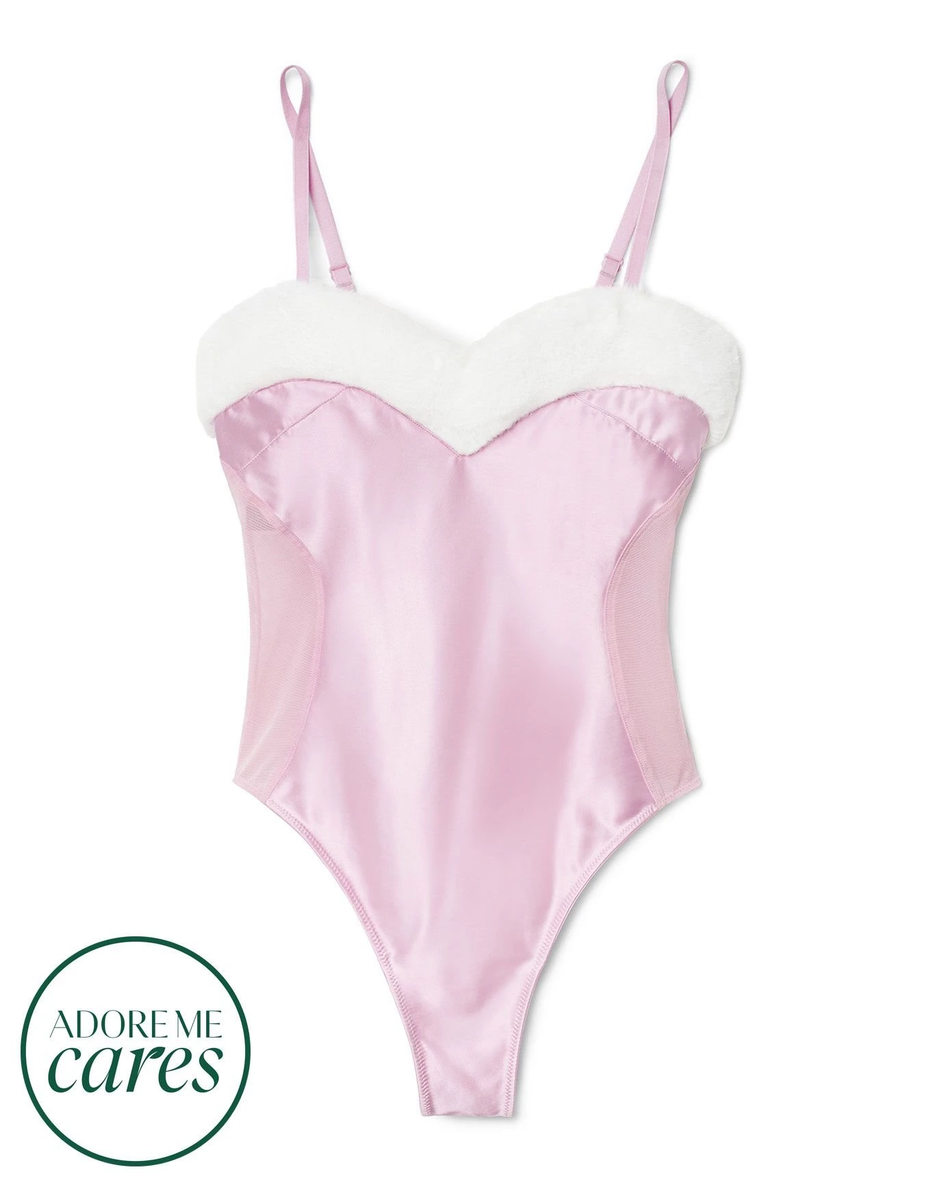 The Jessica Bodysuit comes with a faux fur sweetheart neckline and bunny tail. It also has satin hourglass front panel, fully adjustable straps, mesh sides and back, and snap closure at the crotch. Pick your size from XS-XL.