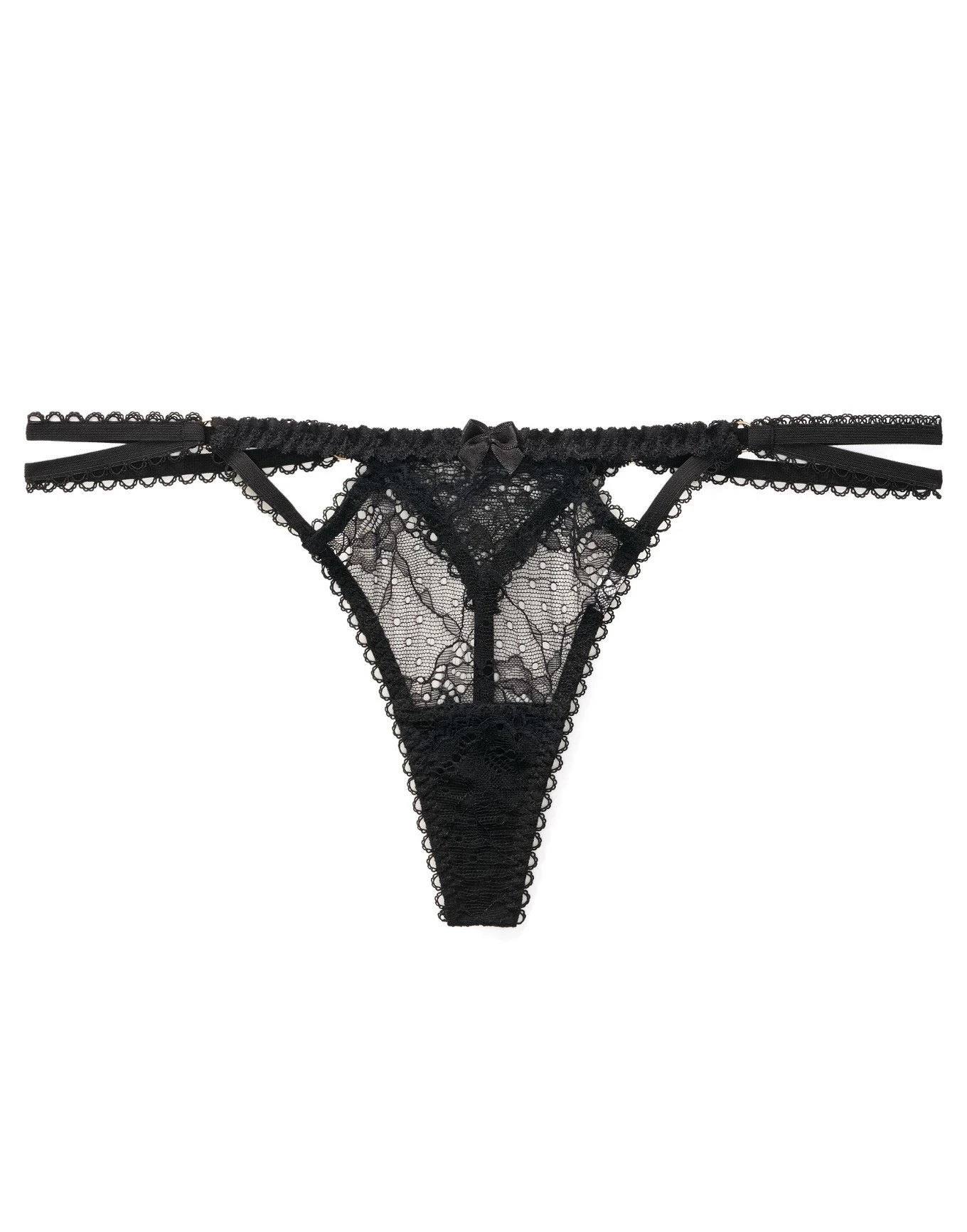 This black thong is adorned with luxurious satin bows as well as strappy details for a sexy and bold look. Made with a figure-flattering lace fabric, this thong is perfect for plus-size women who want to feel sexy and confident. (Available in plus-sizes 0X-4X.)