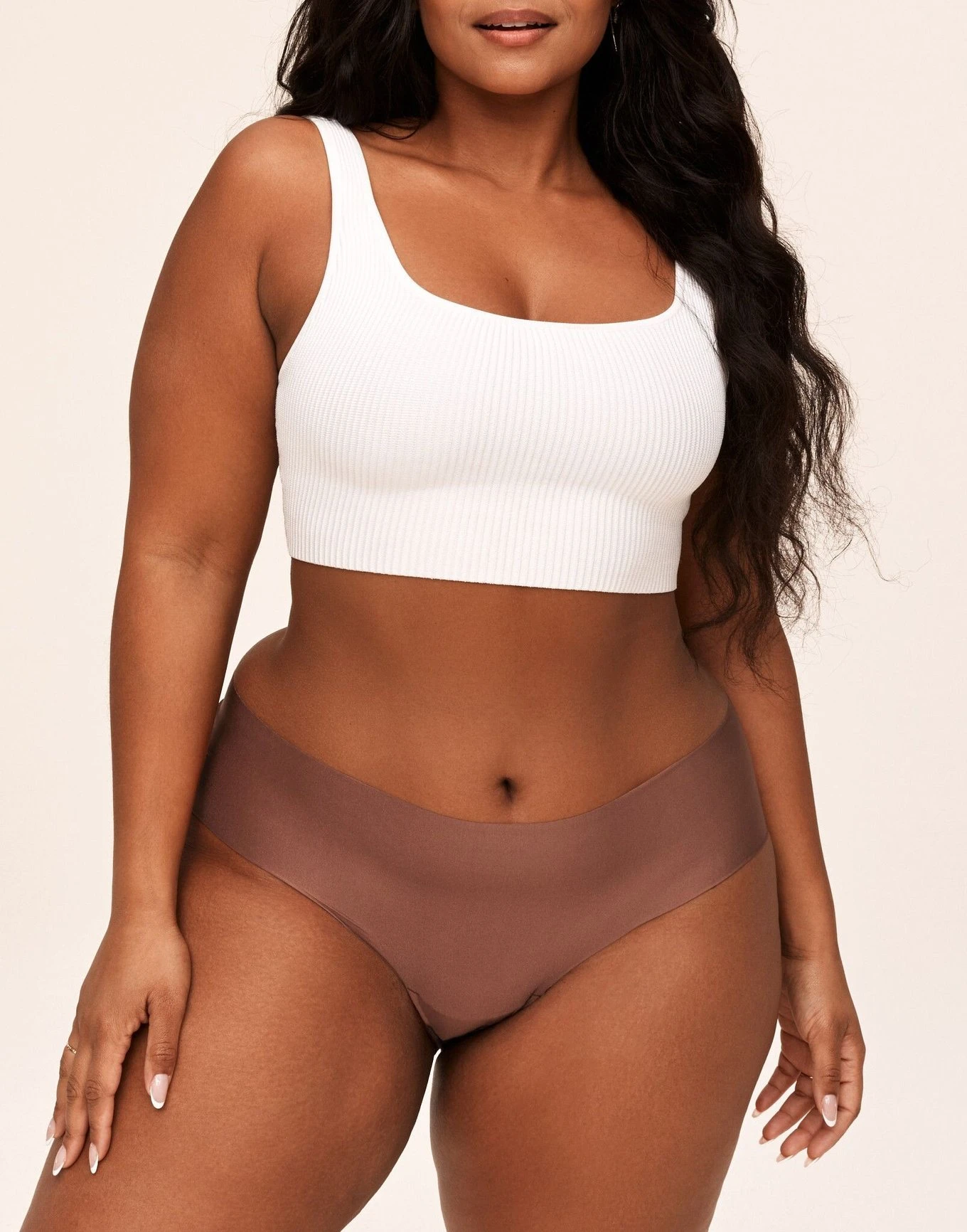 These hipster-style panties come in a dark brown hue with a raw-cut finish for a touch of edge. They’re made of a microfiber fabric that’s perfect for everyday wear. (Available in plus-sizes 0X-4X.)