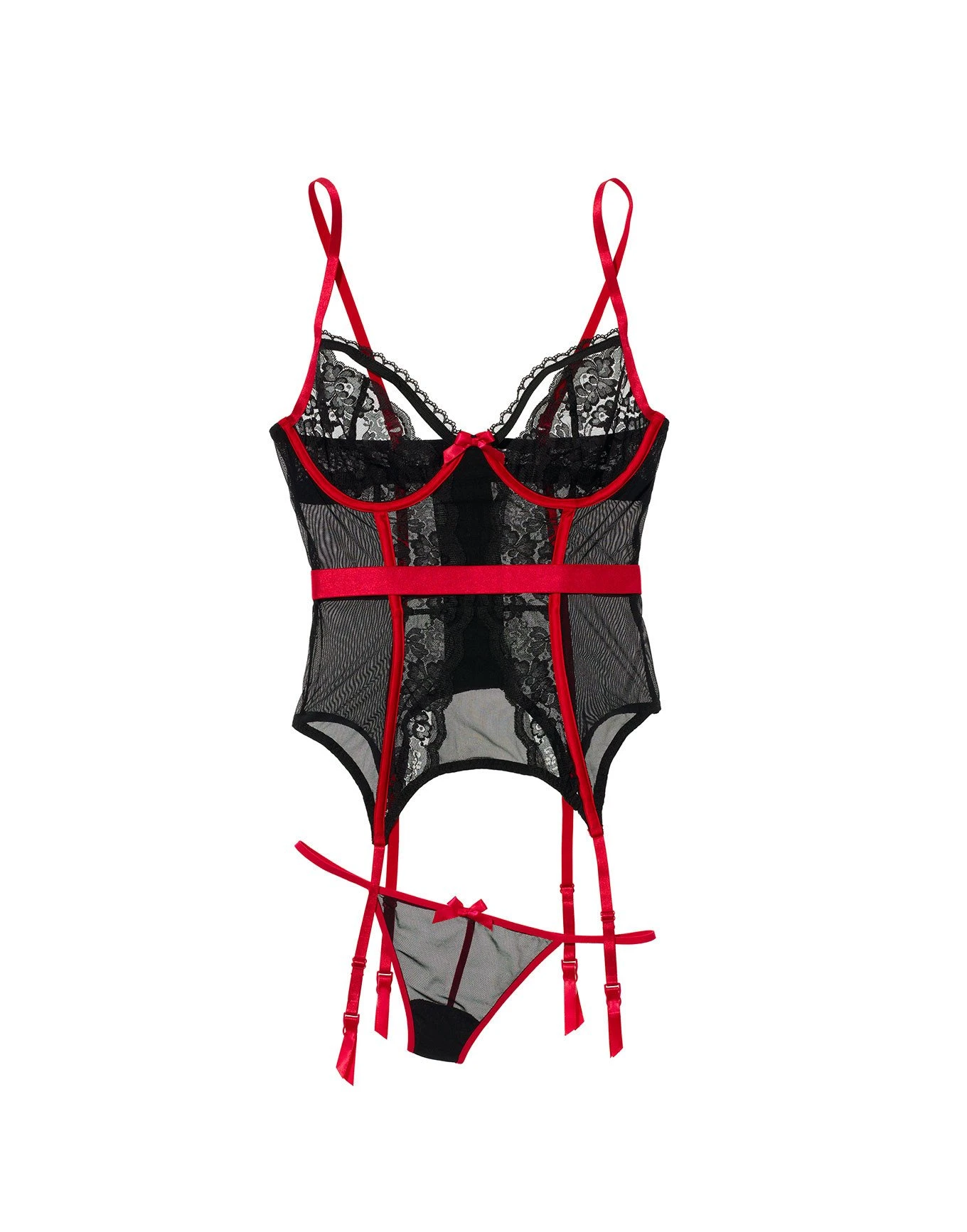 Strappy? Check. Lace? Check. Sheer? Check. Lyla has everything you could want in a bustier. Trimmed in a rich red and all tied together with a shiny elastic waistband, she is sure to flatter every body. Pair Lyla with her matching thong and a pair of stockings to rock the look!