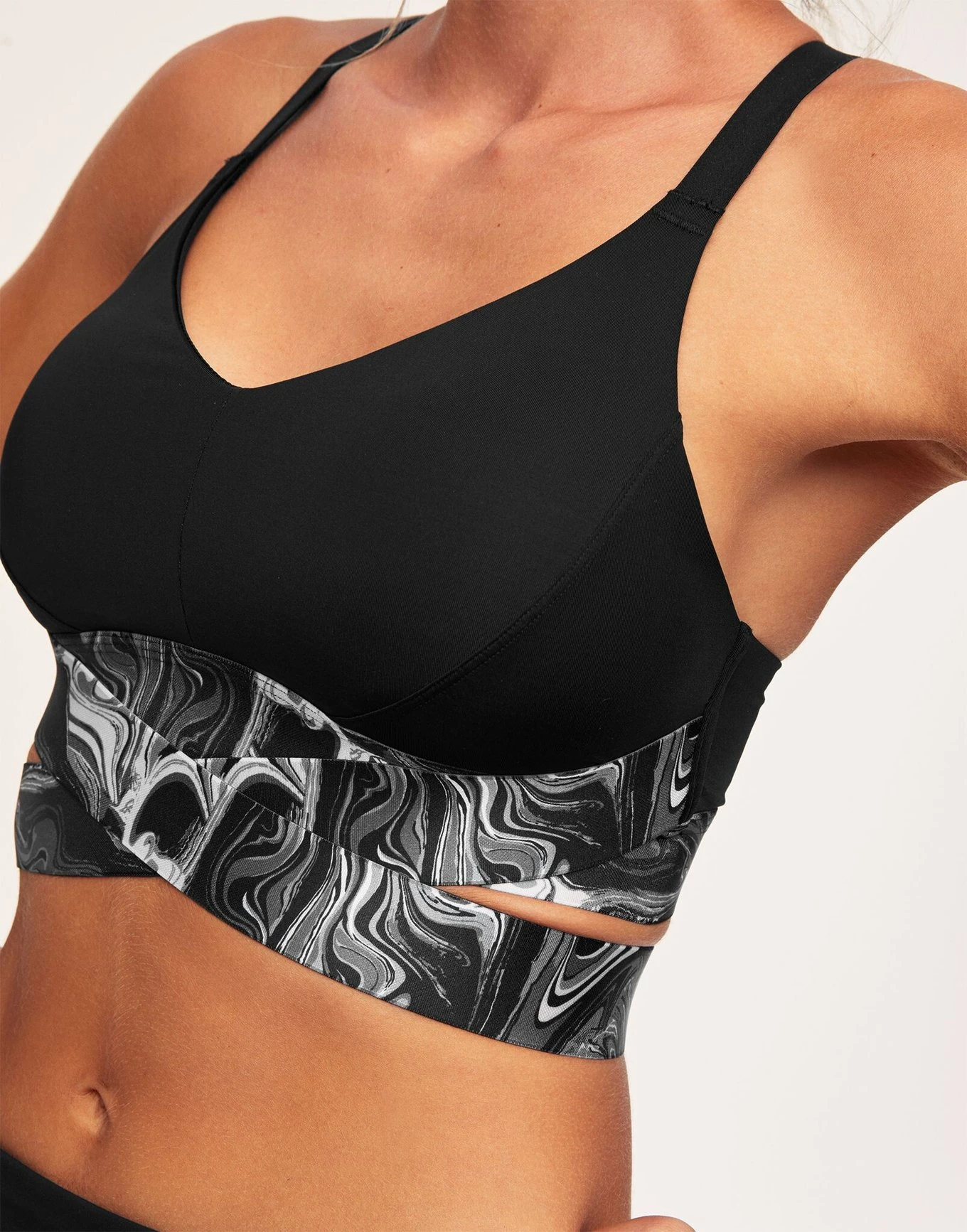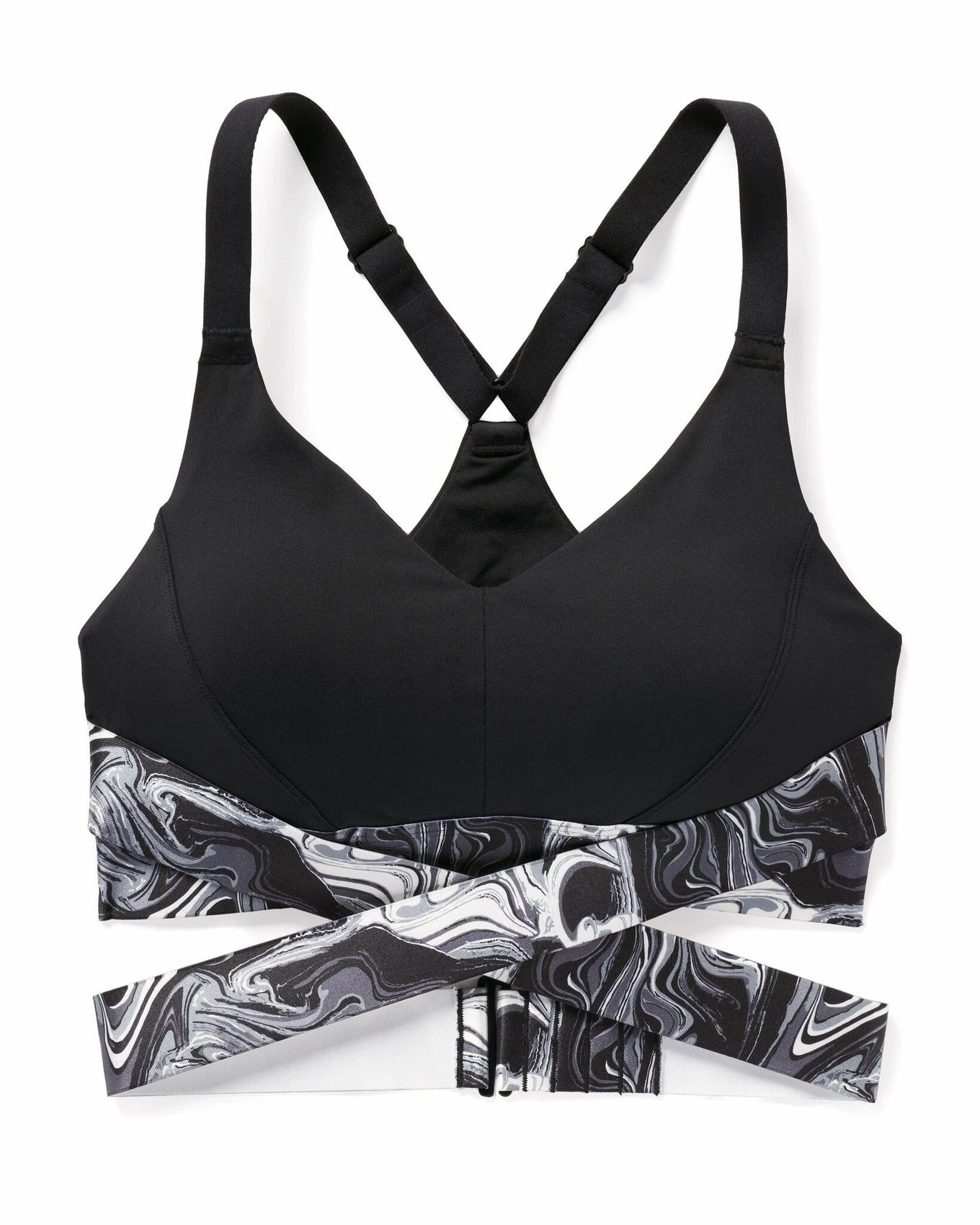 Marble to marvel! Your best workout ever starts with this next-level black sports bra feat. cool strappy details for extra support & style. Slip it on over your head, wrap the straps around to adjust ‘em to your liking, and work out! Created for medium-impact activities like running, indoor cycling, cardio classes & more—and made to show off during your post-workout “treat yo’self” brunches—Maven’s the perfect match for a stylish yet ambitious person like yourself.