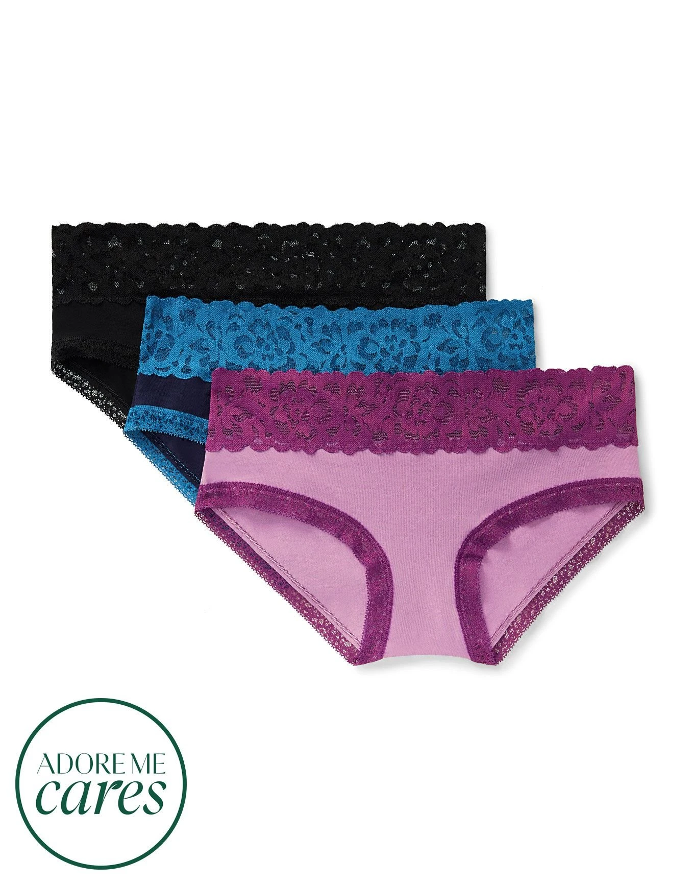 These hipster panties come in a pack of three and are made with a soft and stretchy cotton-jersey fabrication. They feature pretty lace trim around the waist and legs and come in black, evening blue, and mauve mist. (Available in sizes XS-XL.)