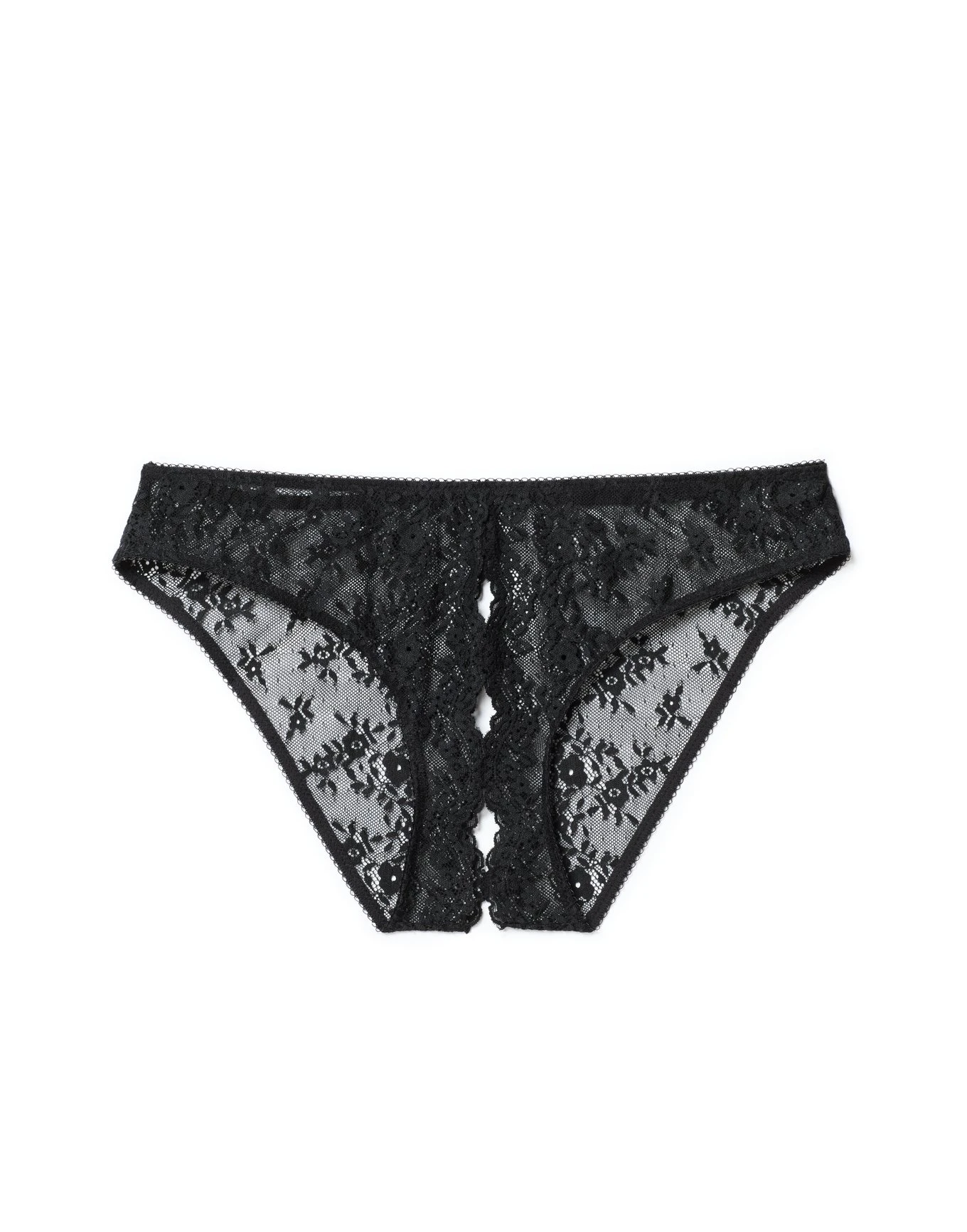 This Rosia crotchless bikini panty is all about the details. With a scalloped lace edge and opening at the crotch, this black panty is as sexy as it is comfortable. (Available in size 0X-4X.)