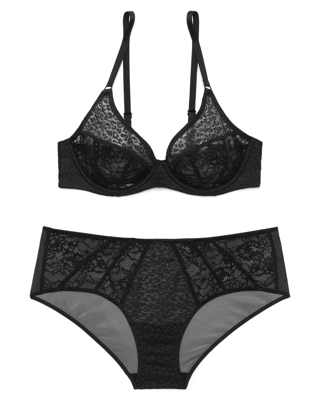 Roxana mixes two of our bestselling lingerie attributes—floral lace and leopard lace!—for the first time ever to create a one-of-a-kind bra your wardrobe’s never seen before. Crafted with sheer unlined demi lace cups in classic black that support & enhance your natural shape and complete with a matching hipster panty, Roxana will easily become your essential set you’ll reach for time & time again. Optional: Let the bra peek out from underneath your favorite tops or blazers for a bold night out. (See Roxana Unlined for more sizes.)