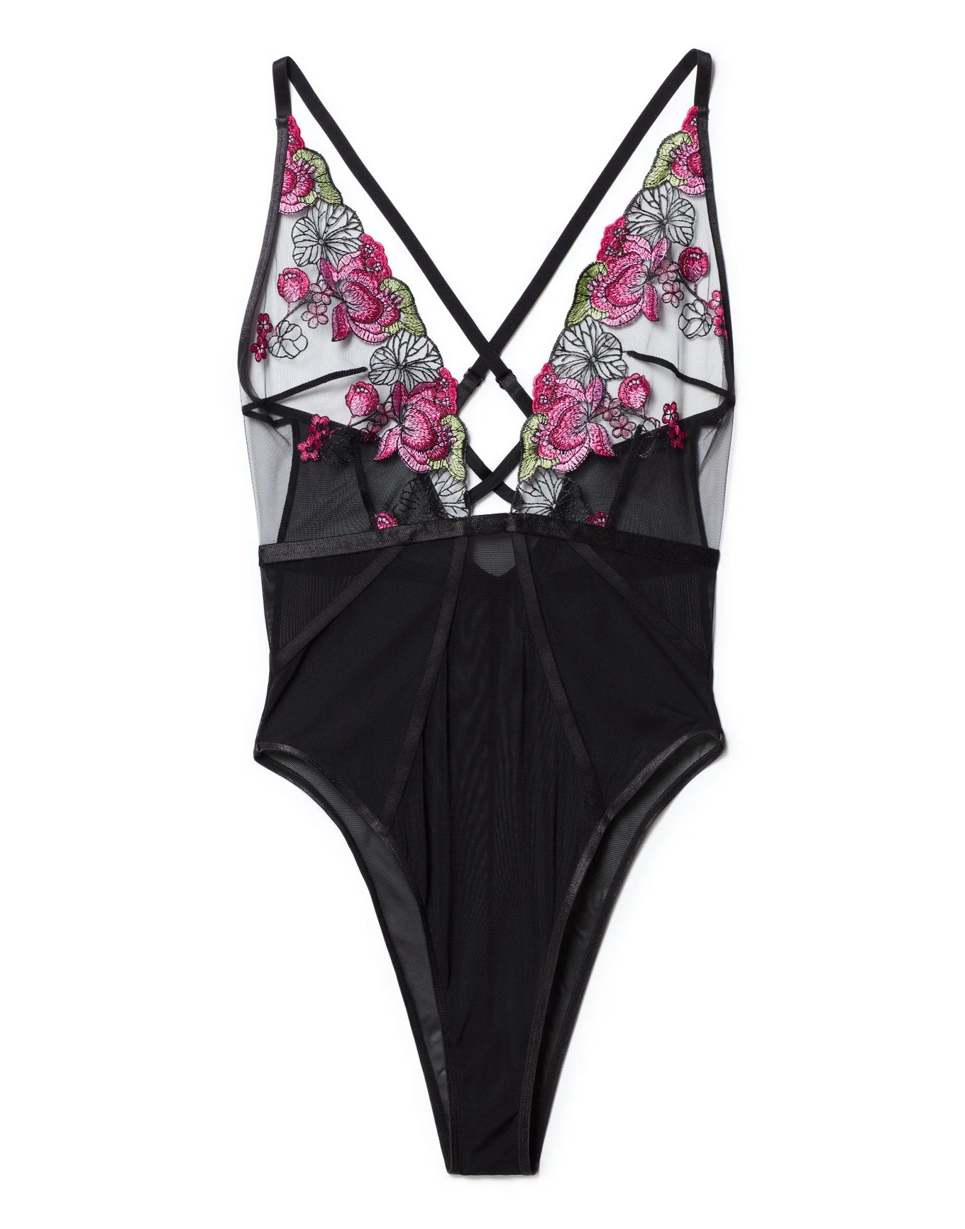 This black bodysuit is decorated with daring multicolor embroidery and features a plunging neckline, adjustable cross-back straps, and Brazilian back coverage. whether you wear it as lingerie or as a layering piece, you’re sure to feel bold and sexy in this one (available in XS-XL).